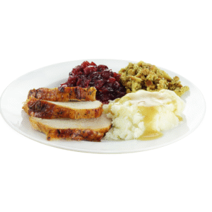 Turkey Leg or Breast, Stuffing, Mashed Potatoes, Gravy.